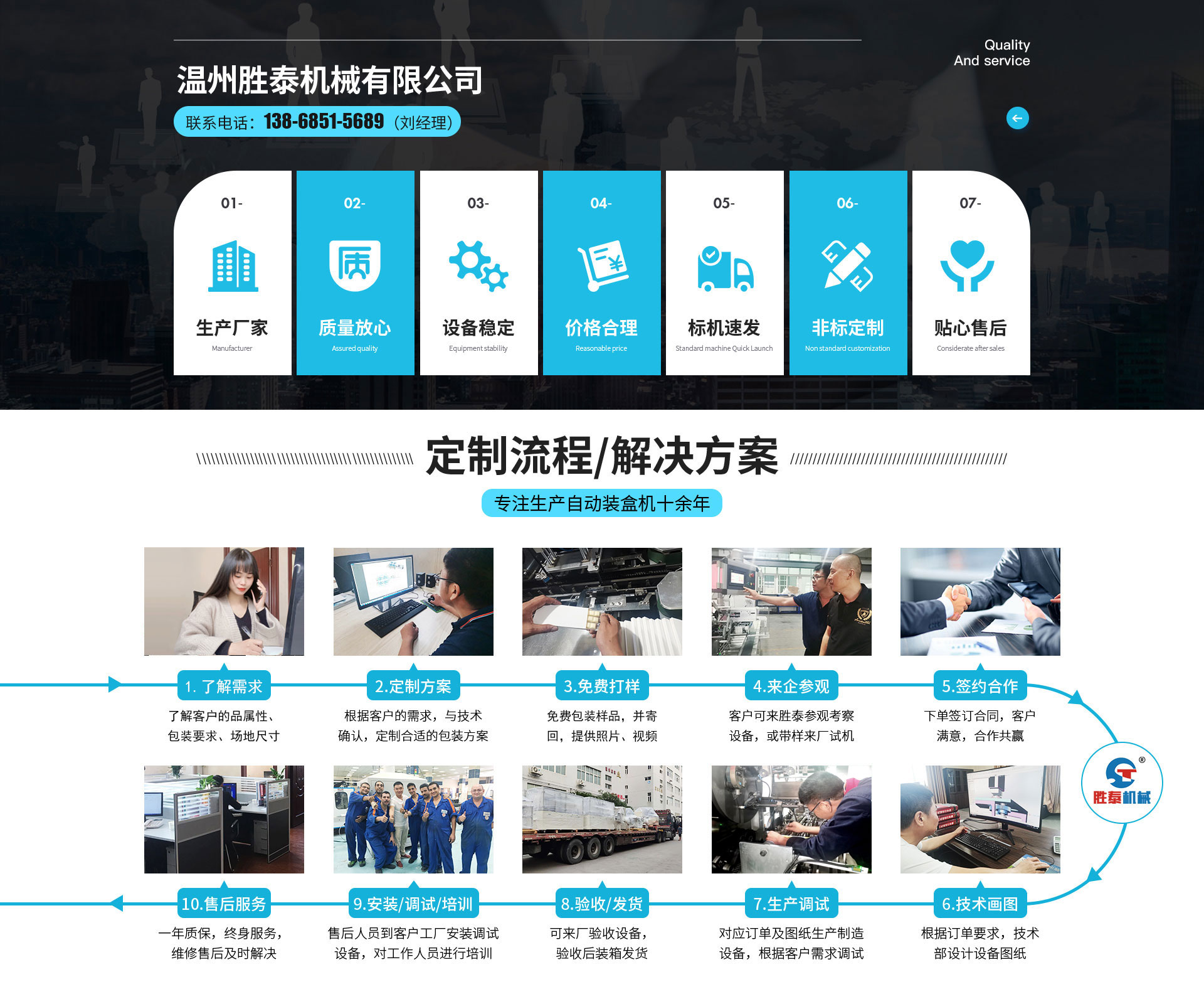 溫州勝泰機械有限公司位于東海之濱, 坐落于"包裝機械城"-溫州市。集研發(fā)、生產(chǎn)、經(jīng)貿(mào)于一體的現(xiàn)代化科技型企業(yè),是國家高新技術(shù)企業(yè),通過了CE認(rèn)證、IS09001質(zhì)量體系認(rèn)證,并獲得了多項專利。從事盒裝紙包裝設(shè)備10余年,具有先進(jìn)的技術(shù)力量和生產(chǎn)工藝,制造經(jīng)驗豐富、產(chǎn)品質(zhì)量可靠、價格合理、能為廣大客戶提供設(shè)備、技術(shù)、原材料供應(yīng)全方位服務(wù),幫助客戶打造專業(yè)化、智能化、無人化的工業(yè)4.0工廠。
